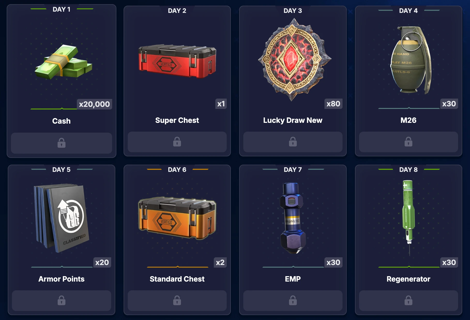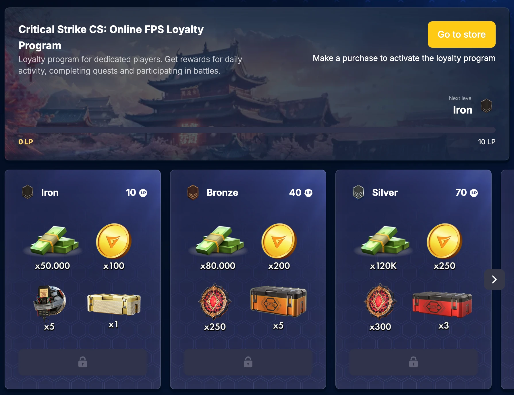 Sadakat Programı, Critical Strike Hub'da yapılan her gerçek para satın alımı için sizi ödüllendirir. Her uygun satın alma işlemi ilerleme çubuğunuzu doldurur ve yeni ödül seviyelerinin kilidini açar. Yalnızca Hub'da yapılan satın alımlar ilerlemenize katkıda bulunur.